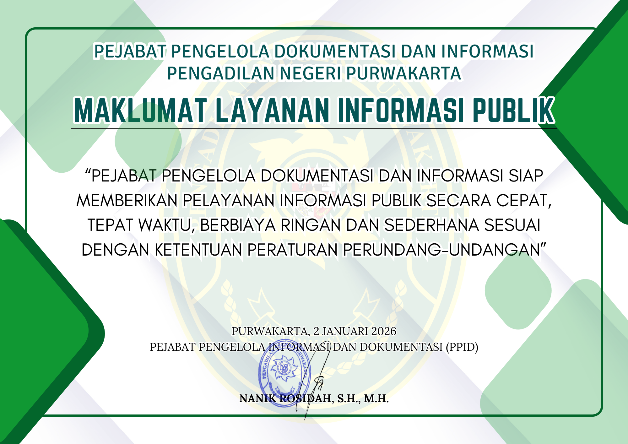 Dalam melaksanakan kegiatan pelayanan publik, Pengadilan Negeri Purwakarta Kelas IB berupaya untuk selalu dapat memenuhi harapan masyarakat, khususnya para pencari keadilan. Bila terdapat informasi yang tidak terdapat di situs pengadilan, masyarakat dapat mengajuan permohonan informasi ke Pengadilan Negeri Purwakarta Kelas IB.